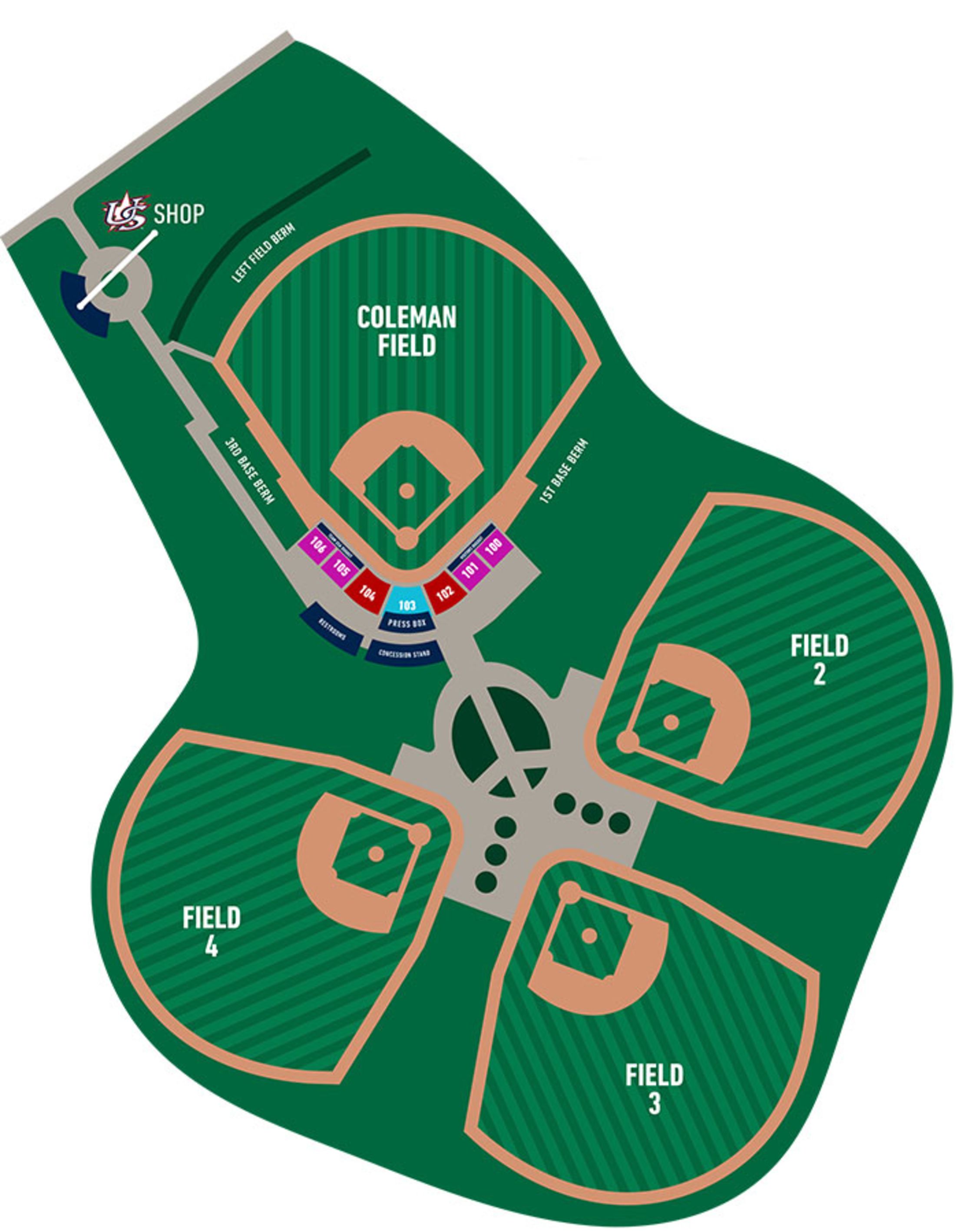 Coleman Field (stadium) has a press box that includes two suites, an official scorer's room, a sound room and a press row. Spectator seating is for 1,754 people, including handicapped accessible seating, and additional grass seating for approximately 250 people, and all fields have access to restroom facilities and a concession building.